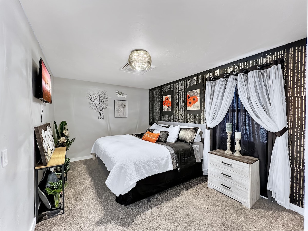 Relájate en este espacio recién remodelado y elegante. Cuenta con una cama tamaño king, baño y área de encimera con microondas, Keurig y mininevera. Esta suite está separada de la casa principal y tiene una entrada independiente, privacidad y espacio de estacionamiento. La casa principal se anuncia por separado y también aparece como una combinación de los dos espacios en Airbnb. Si este anuncio se muestra disponible, solo es el estudio/casa independiente. Pregunta si tienes alguna pregunta o para obtener más información.