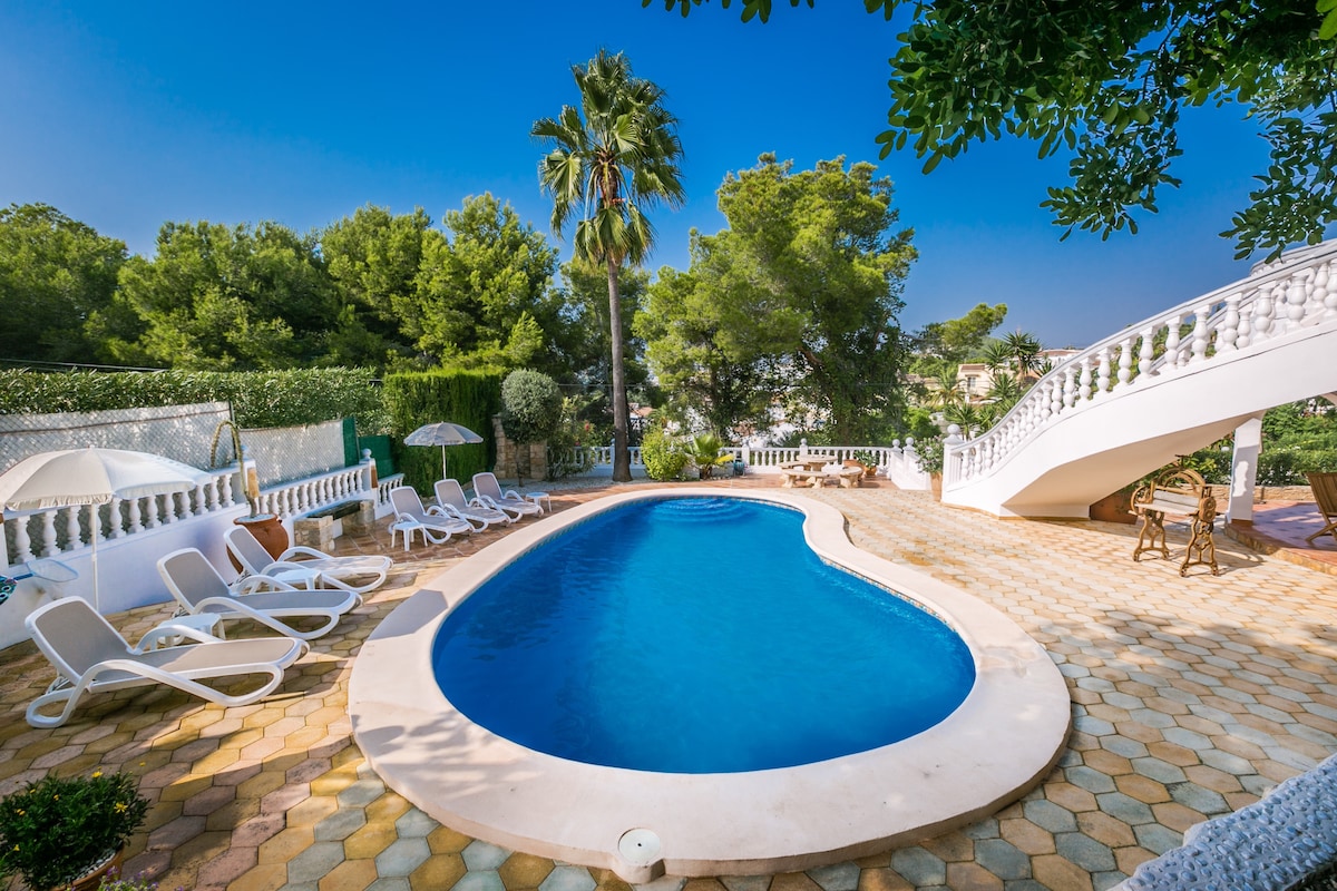 "Villa Sunset Moraira": disfruta de los días de ensueño en una villa modernizada de estilo español para hasta 8 huéspedes. LO más destacable: - piscina privada (con calefacción) - Gran zona exterior con vistas al sur. - Cocina exterior con barbacoa. - aire acondicionado, ventiladores y calefacción en todas las habitaciones. - Muebles de alta calidad - 3 dormitorios con camas de somier. - 2 baños modernos con ducha y bañera. - Cocina totalmente equipada. - Wifi rápido. - Televisión inteligente - Ubicación tranquila, cerca de la playa. ☆ "¡La villa de Clio es una joya absoluta!"