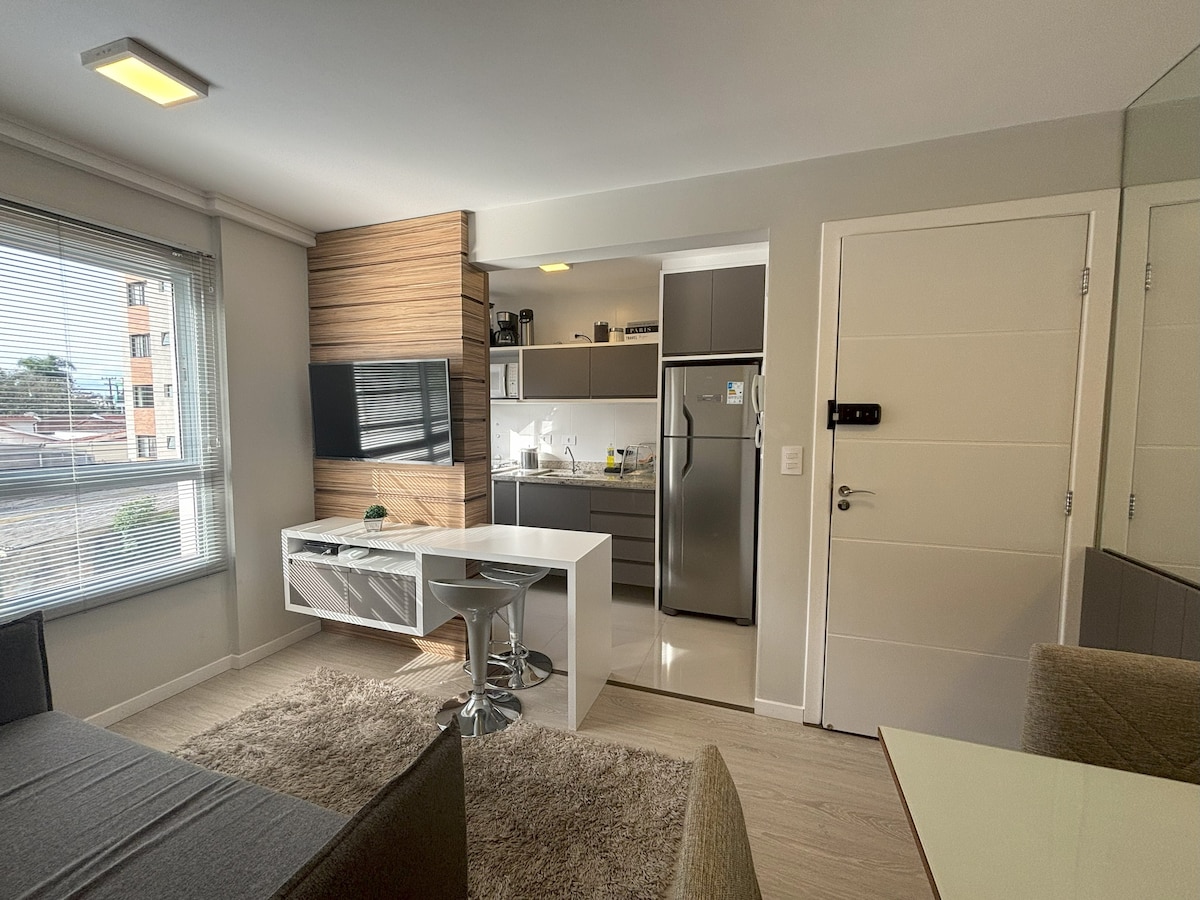 Relájese en este espacio tranquilo y elegante. Apartamento finamente decorado y totalmente equipado con vajilla, ropa de cama y toallas, listo para alojarse. El apartamento cuenta con: 1 habitación doble amueblada y equipada con TV 1 baño con ducha blindex 1 sala amueblada Cocina amueblada y equipada 2 balcones, uno de los cuales da a la calle. Plaza de estacionamiento cubierta Próximo: BR 116 - 300 M Jardín botánico - 800 M Centro de Curitiba - 5 km