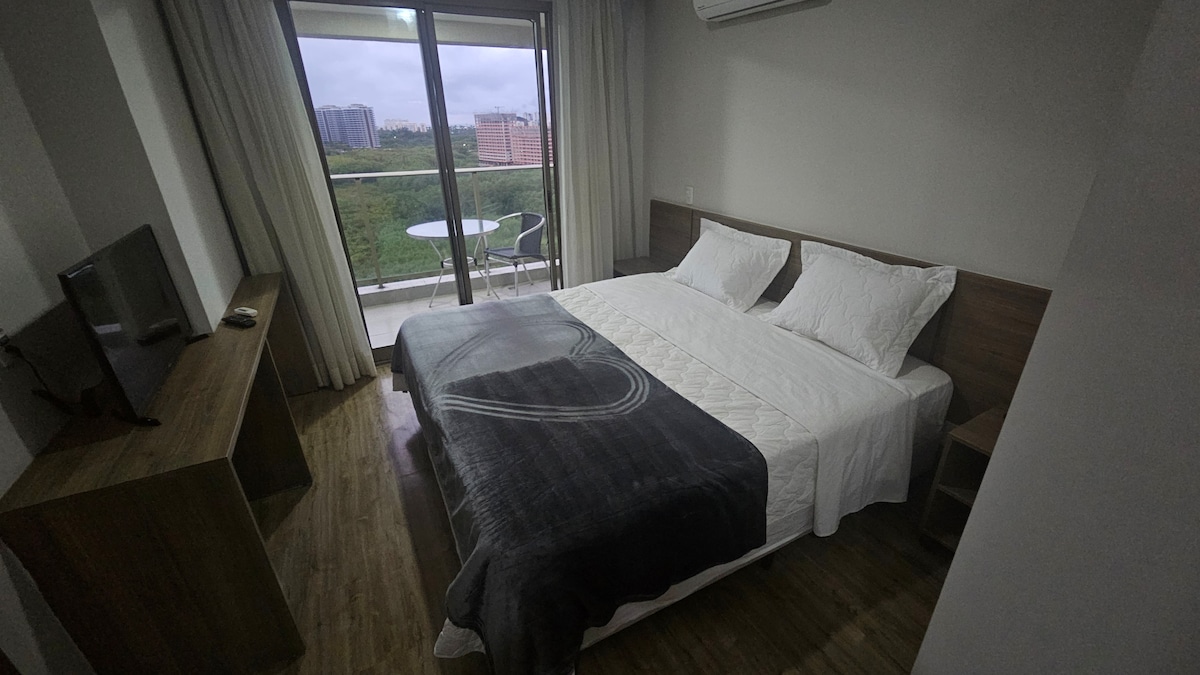 Apartamento estilo flat super acogedor y hermoso, con decoración moderna y limpia, perfecto para aquellos que quieren disfrutar de su momento de trabajo o de ocio con comodidad, seguridad, limpieza y buena ubicación. El sol es de la mañana, vista libre al campo, piso alto, ambiente refrigerado. El apartamento tipo flat se encuentra dentro de un condominio cerrado con seguridad, área de ocio con piscina, sala de fitness, sauna y tienda de conveniencia para compras rápidas. El espacio es adecuado para dos personas