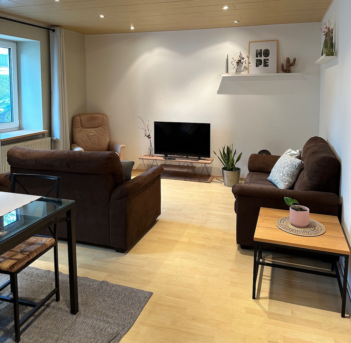 Die ca.50qm große Wohnung befindet sich in einer verkehrsberuhigten Straße. Parkplätze befinden sich direkt vor dem Haus. Die Ferienwohnung hat einen seperaten Eingang und ist im Souterrain. Im Wohn/Schlafzimmer ist ein Boxspringbett 1,80x2,00(kann man auch als 2 Einzelbetten stellen)Schreibtisch, SatTv,Radio, Bad ,komplette Küche mit Essecke, Waschmaschine, Kaffeemaschine, Toaster, Wasserkocher, Mikrowelle. Internet Übernachtungen ab 4 Wochen bitte separat Anfragen.Nichtraucherwohnung