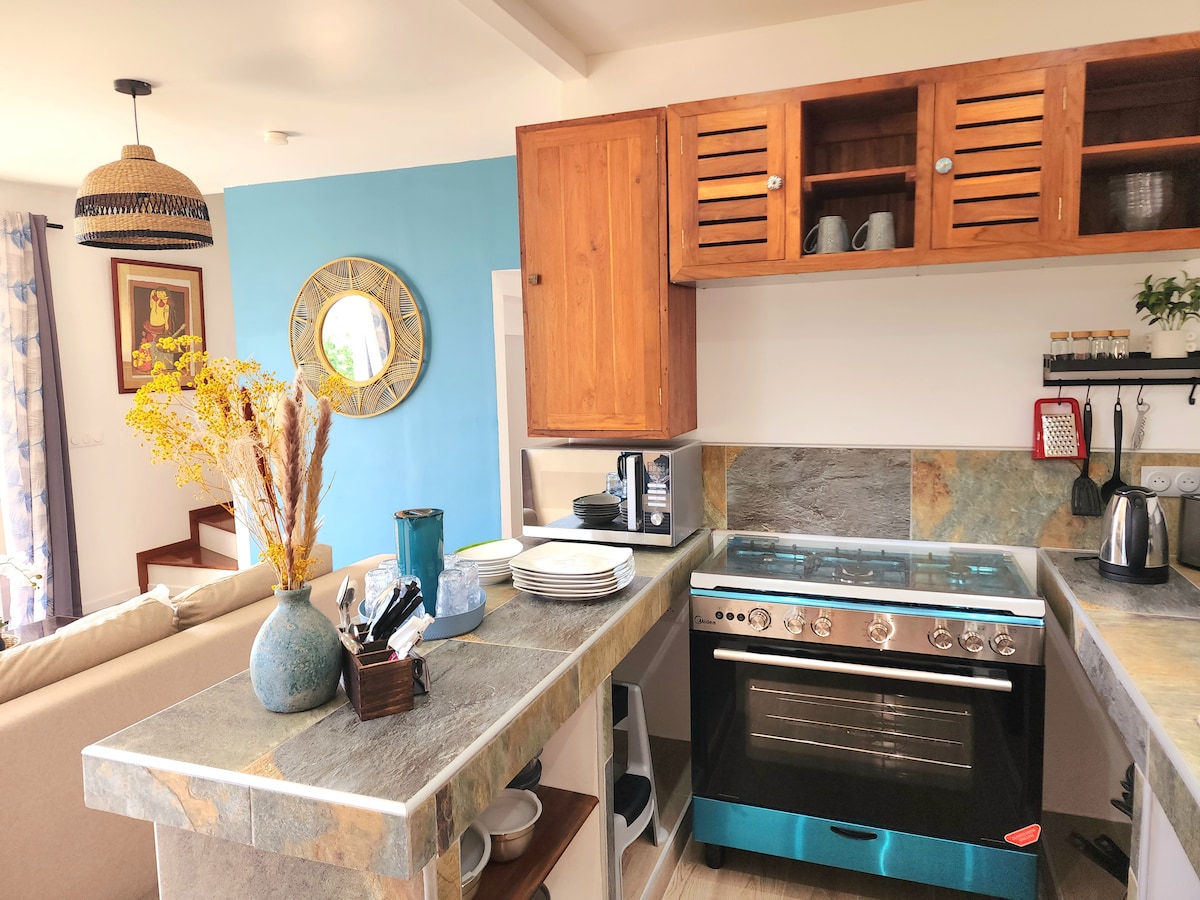Situada junto al mar, esta hermosa casita ofrece acceso directo y unas vistas maravillosas de la laguna. La casa consta de un dormitorio con aire acondicionado (cama tamaño queen), 1 baño, 1 sala de estar (posibilidad de dormir 1 o 2 niños) y 1 cocina. ¡Este espacio privado es ideal para parejas o familias! Una terraza exterior abierta con mesa y sillas permite disfrutar del aire marino y de las comidas familiares con una espléndida vista al mar.