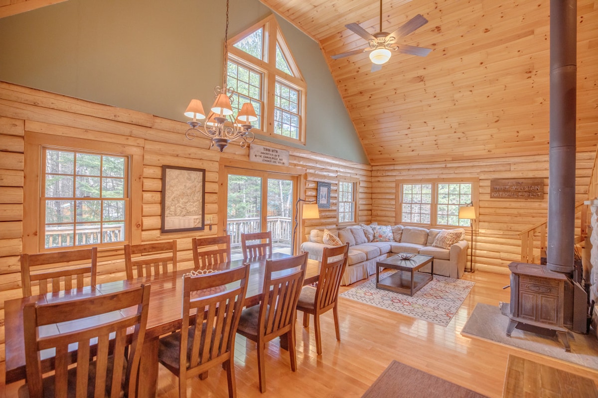 Cabaña de cuento de hadas en el entorno de películas de Hallmark. Cabaña de madera con comodidades modernas, 9 camas, diseño con temática de osos. Chimenea de mampostería, playa privada, 32 acres de tierra llena de vida silvestre. Senderos a los humedales, paseos frente al río. Esquí, pesca, senderismo, tubing fluvial. Acogedora estufa de leña, jacuzzi y patinaje sobre hielo de temporada y voleibol de temporada. Vistas de la pista de esquí de West Mountain Disfruta de la cubierta y observa cómo el águila calva residente volando. Avistamientos de alces en la puerta principal. Siéntete alejado de todo en Bretton Woods. ¡Los perros son bienvenidos!