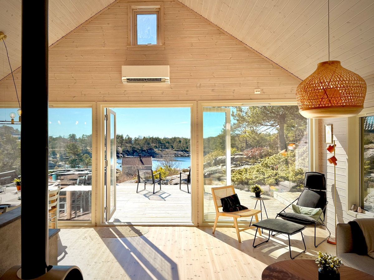 The cabin is surrounded by nature, with access to salt- and freshwater activities. Six-meter-wide panoramic windows open onto a sunny deck for barbecuing, sharing meals, lounging, or resting in the hammock. At night, light the fire pit, pop some popcorn, and enjoy the starry sky. Families will appreciate the child-friendly setup, while adults can enjoy the bright Scandinavian design. It's an ideal base for exploring beaches, woods, Kristiansand, Dyreparken Zoo, Aquarama, and more.