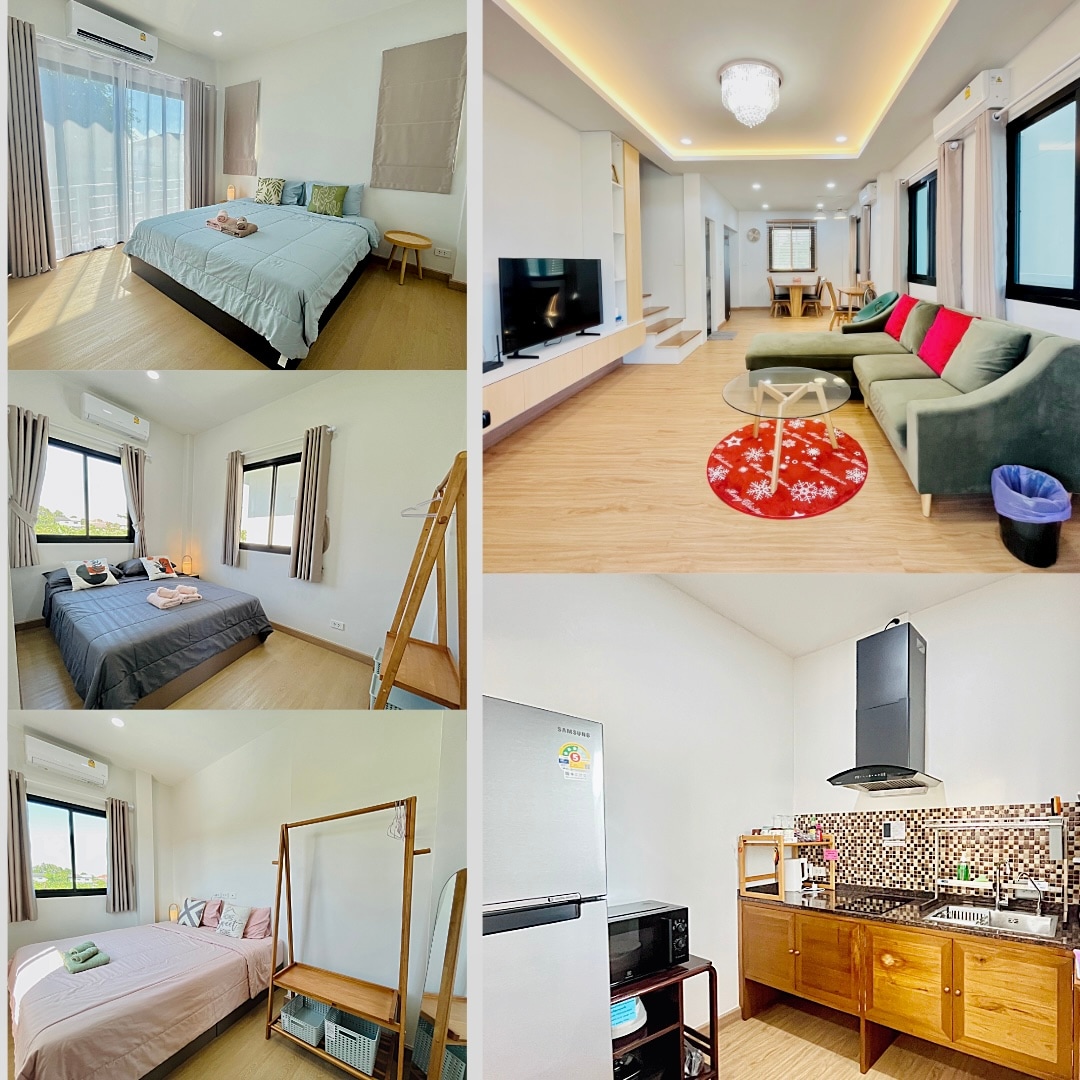 🏡 Fully equipped & furnished/ 3 bedrooms /3 baths ( with water heaters )/ 2-3 cars parking on premises / max. 6 guests 🚫🚬 🛌Room1: 1 king bed + attached bathroom 🛌Room2: 1 queen bed 🛌Room3: 1 king bed ✅TV ✅internet ✅kitchen supplies ✅ Electric stove ✅Microwave ✅fridge ✅washing machine ❌ no dryer 🚙 500 m. to 7-11, Lotus, shops 🚙 3 km. to KKU, Sri Nakarind 🏥, Lotus Extra, Makro 📌 KKU : famous restaurants & cafes / shops / museums