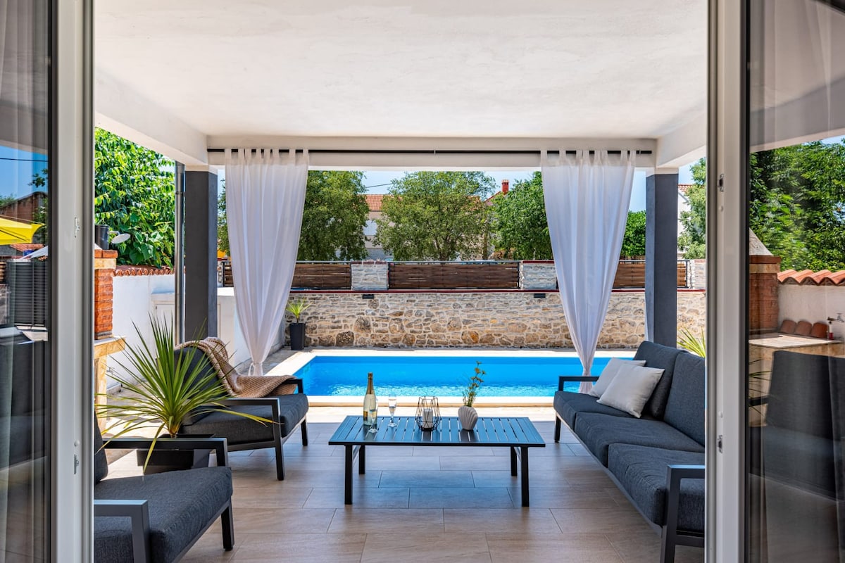 "Villa Mare" le ofrece paz y tranquilidad en el ambiente de la naturaleza virgen del pueblo, y está a solo 10 minutos en coche de todo lo que la ciudad de Zadar le ofrece. (tiendas, monumentos, restaurantes, vida nocturna) "Villa Mare" es una casa nueva (2018) construida en un estilo mediterráneo tradicional (piedra y madera) combinado con elementos modernos. La villa tiene un campo de 800 m2 con plantas y hierbas reconocidas como olivos, arbustos de lavanda...