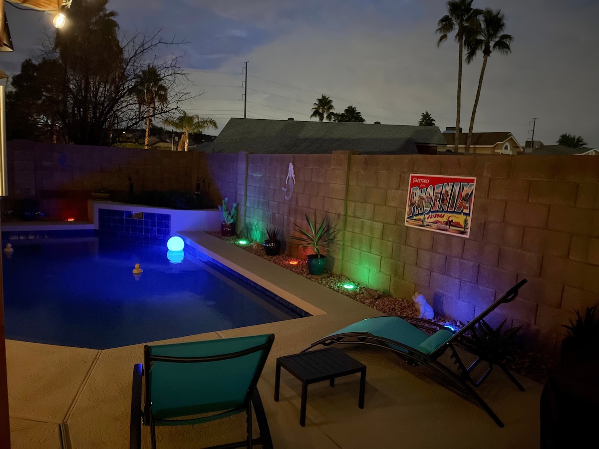 Entorno tranquilo y silencioso en un callejón sin salida en Phoenix AZ con muebles y servicios cuidados. El patio trasero es un oasis de cactus con chimenea, zona de parrilla y un gran patio para el entretenimiento y el disfrute. Esta alegre casa en una ubicación fabulosa tiene un garaje de juegos con mesa de billar, ping pong y tablero de dardos. Trae a tus invitados y relájate en este entorno tranquilo. La piscina se puede climatizar para disfrutar. Solo tienes que informar al anfitrión de que te interesa esta función.