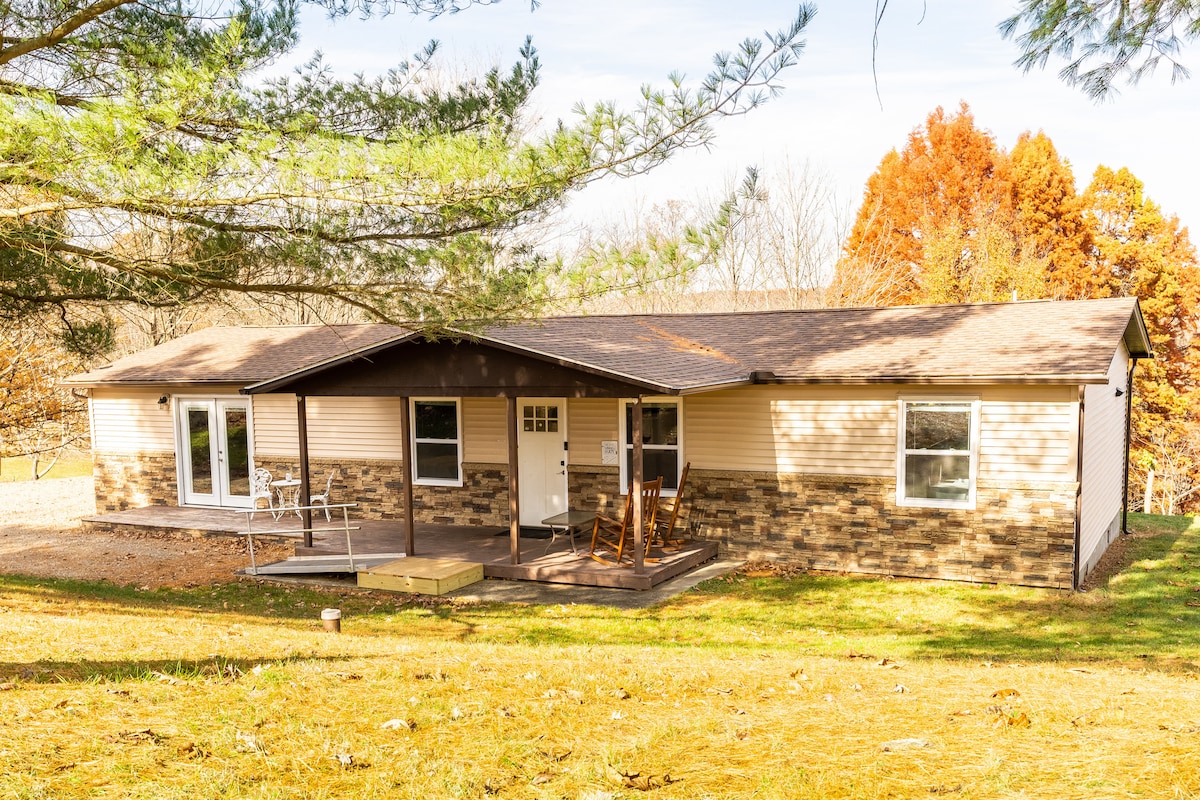 Olvídate de las preocupaciones en este gran alojamiento: ¡es un oasis de tranquilidad! Ubicado en las colinas de Nashport Ohio. Relájate en el jacuzzi, reúnete alrededor del fuego o cocina en la terraza. El interior cuenta con una gran sala de estar abierta con vistas completas al bosque, muchos asientos, comedor, una cocina totalmente equipada, 3 dormitorios acogedores y una pequeña habitación con literas. Nuestra casa se encuentra a pocos minutos del parque estatal y camping de Dillon, el camping Lazy Acres y la reserva natural Black Hand Gorge. Ubicado entre Newark y Zanesville.