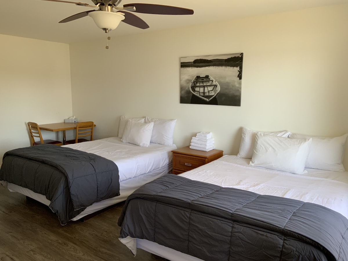 Amanecer 7: Disfruta de una acogedora habitación de estilo motel con dos camas tamaño queen, con una vista impresionante del lago. La ocupación máxima es de 4 personas.