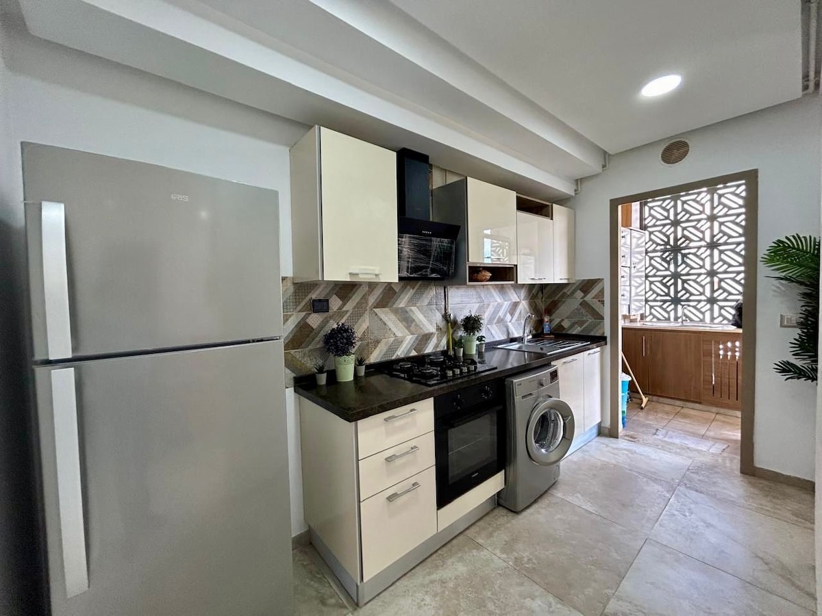 Relájese en este magnífico apartamento tranquilo y elegante en Hammamet. Situado a 5 minutos a pie de una de las mejores playas de Hammamet (Hotel Nahrawess), así como de los cafés, hoteles y restaurantes más populares de la zona. El alojamiento también dispone de una plaza de aparcamiento privada y vigilada por cámara y vigilante.