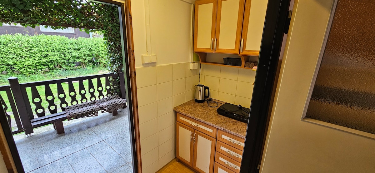 Acogedor apartamento en el primer piso, que tiene una cama doble en el dormitorio y un sofá cama en la sala de estar. El apartamento tiene una cocina con un pequeño balcón. Hay muchas excursiones en los alrededores, sobre las cuales estaremos encantados de asesorarle. En el jardín hay una gran cama elástica, un columpio para niños, una chimenea y la posibilidad de alquilar una parrilla.