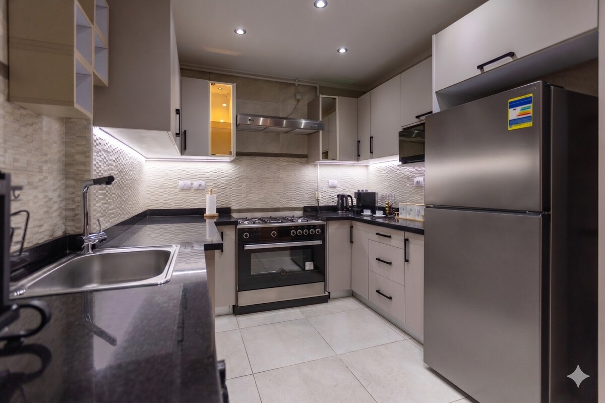 ¡Bienvenido a su estancia perfecta en El Cairo! A solo 13 minutos del aeropuerto de El Cairo, a 10 minutos del Quinto Asentamiento y a 20 minutos del centro de la ciudad. Este apartamento moderno y luminoso cerca de Nuevo Cairo y Heliópolis es ideal para viajes de negocios, turismo o escalas. Disfruta de wifi rápido, una cocina totalmente equipada y un barrio tranquilo: ¡comodidad y conveniencia en el corazón de El Cairo!