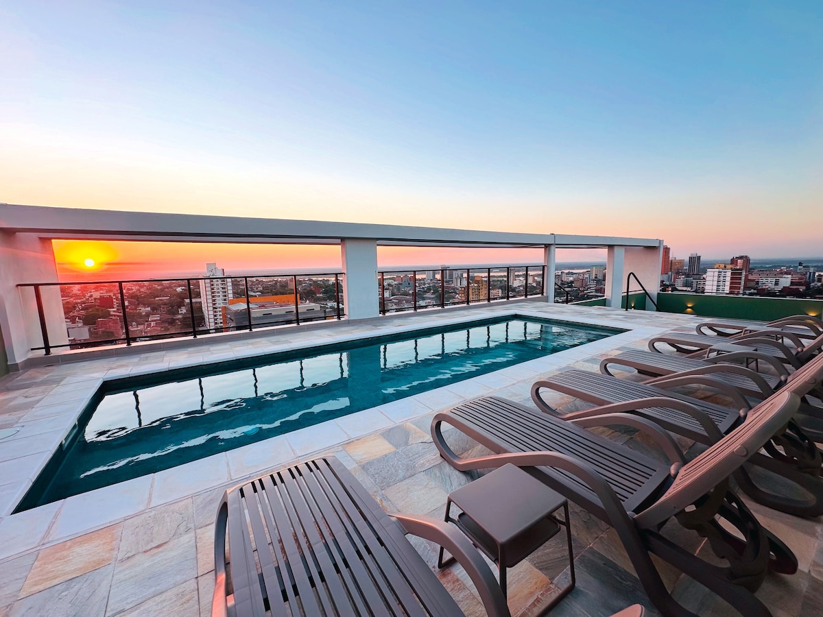 Disfruta de una experiencia en un barrio típico asunceno, en el centro de Asunción, c/ balcón y parrilla privada. Edificio con piscina y gym. Guardia de Seguridad 24 hs en el edificio. Zona residencial, cerca del microcentro, ideal para despejarse. Cerca de parques, locales comida, a minutos del centro típico de la ciudad. De fácil acceso, a una cuadra de la parada de colectivos. A 1.5 km del Estadio Def del Chaco. Ideal para partidos de Copa Liber y Suda