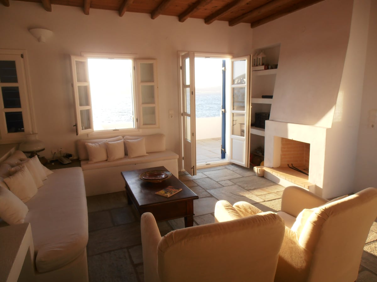 4 bedroom villa in Paros, on the seafront. Spacious terraces on two levels offering unrestricted view towards the sunset and the harbour-Venetian castle of Naoussa. Small bay in front of the house where one may swim. Pleasant two-minute walk to the village centre and all amenities. We are happy to welcome our guests in person at any time until 11:00 PM. Alternatively, self check-in is also available Please let us know if you prefer not to have an in-person check-in.