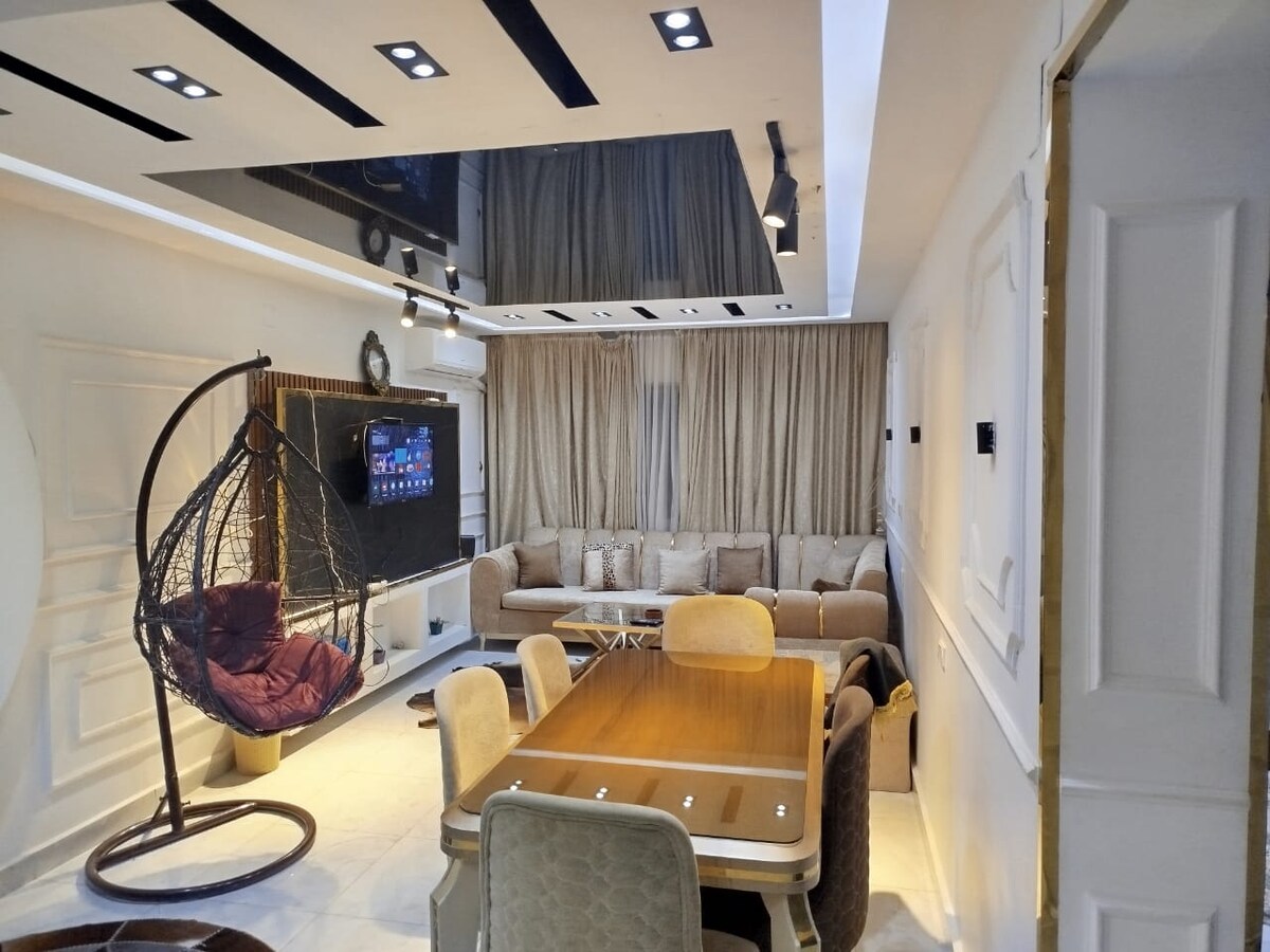 Enjoy a wonderful stay in a new apartment air conditioner in a great location with 3 rooms. 1st room has a king bed,2nd room has 2 beds,3rd room a sofa bed. bathroom hot and cold water. new kitchen and a water filter. Amazing view from balcony. The Apt. is located inside a gardenia comp. 13 min away from Cairo airport and next to the most wonderful malls in Cairo. 400M from Apt there is a tourist mall, restaurants, cafes, and amazing places for shopping.perfect discount for long term stay 👌