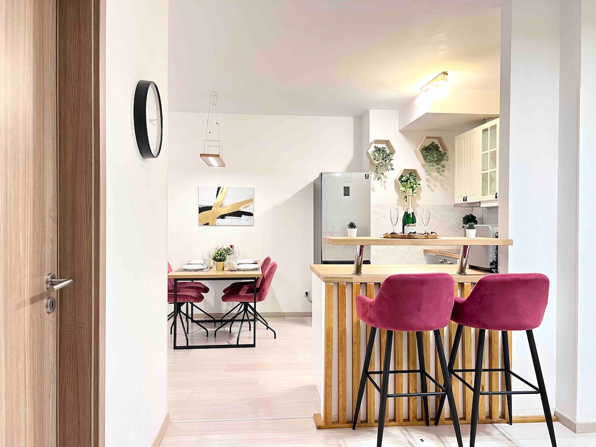 Explora Budapest desde nuestro apartamento céntrico, que combina a la perfección diseño moderno y tranquilidad. A minutos del centro, disfruta de las puestas de sol en nuestra terraza y relájate en un espacio sereno. Olvídate de las molestias del aparcamiento con nuestro garaje seguro; explorar la ciudad es fácil gracias al transporte público cercano. Sumérgete en la vitalidad de Budapest mientras disfrutas de un retiro tranquilo. ¡Bienvenido a la vida urbana con un toque de calma!