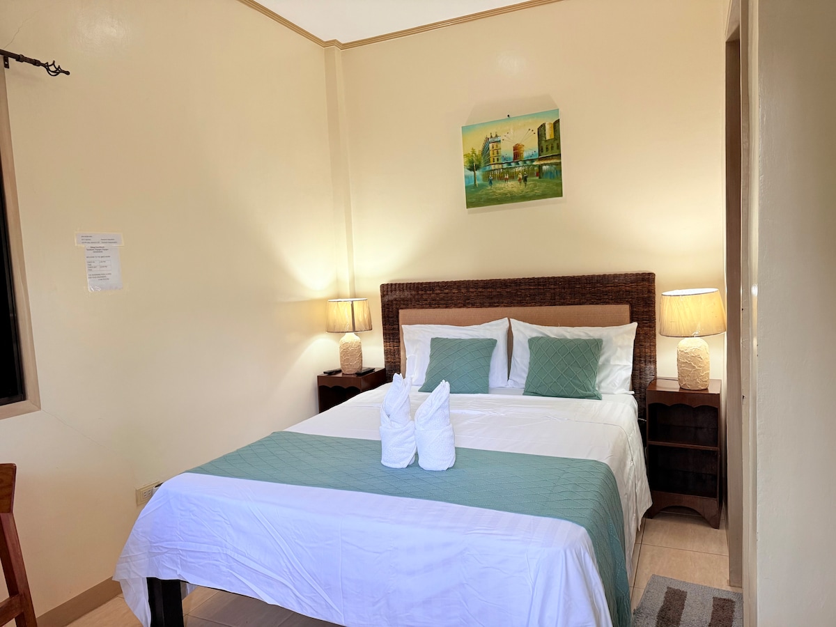 Acogedor y cómodo estudio con pequeña cocina en un encantador entorno tropical, con hermosas vistas a la piscina y terraza privada. Incluye cama tamaño queen, TV de pantalla plana, ducha caliente/fría, aire acondicionado, Internet inalámbrico rápido. Máximo de huéspedes: 3 Tranquilo, privado y cómodo. Ubicado a aproximadamente 2 minutos (en moto) a 10 minutos (a pie) de la vibrante playa de Alona en la isla de Panglao, Bohol. Las reservaciones de excursiones y el alquiler de motocicletas (scooters) están disponibles en la recepción.
