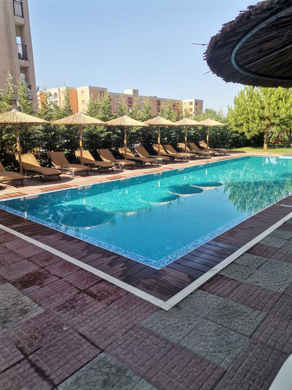 Modern en volledig uitgerust appartement, ideaal gelegen tussen het charmante Nessebar en het bruisende Sunny Beach. Het beschikt over een slaapkamer met 2-persoons bed, slaapbank in de woonkamer, keuken, terras, 2 airco's, tv en strandparasol, twee zwembaden: op 20 en 60 meter, een eigen groote terras en een speeltuin. Supermarkten, restaurants, café liggen op loopafstand. Rustige, groene omgeving met goede verbindingen. Parkeren is gratis. Luchthaventransfer beschikbaar tegen extra betaling.