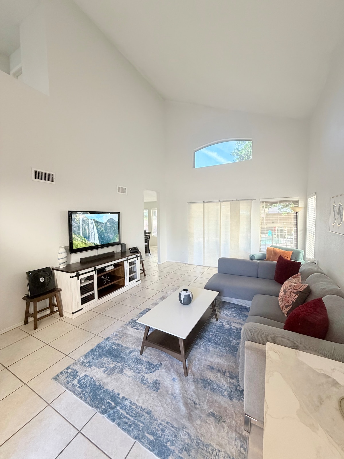 This 2000 sq ft home offers a little luxury and everything you need for a comfortable stay while enjoying your time in the desert. Keyless entry, WiFi, Roku smart TV, Bose bluetooth speaker allow for effortless access to entry & entertainment. Fully equipped kitchen. Patio space in back allows time for sitting in the afternoon sun while BBQing a meal on the furnished gas grill. Two community pools (one heated) with guest access, as well as parks and playgrounds.