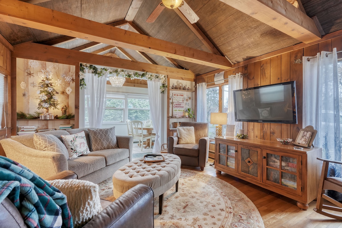 Bienvenido a The Enchanted Hideaway, una acogedora cabaña de cuento envuelta en árboles y magia suave, a solo 5 minutos a pie de una playa privada del barrio. Este es un lugar para bajar la velocidad, reconectarse y volver a respirar profundamente. Disfruta de tu café matutino con el canto de los pájaros, pasea por la orilla para ver la puesta de sol o sumérgete bajo las estrellas en tu jacuzzi privado. Tanto si estás celebrando una ocasión especial como si simplemente necesitas descansar, este refugio te invita a sentirte tranquilo, en paz y a gusto.
