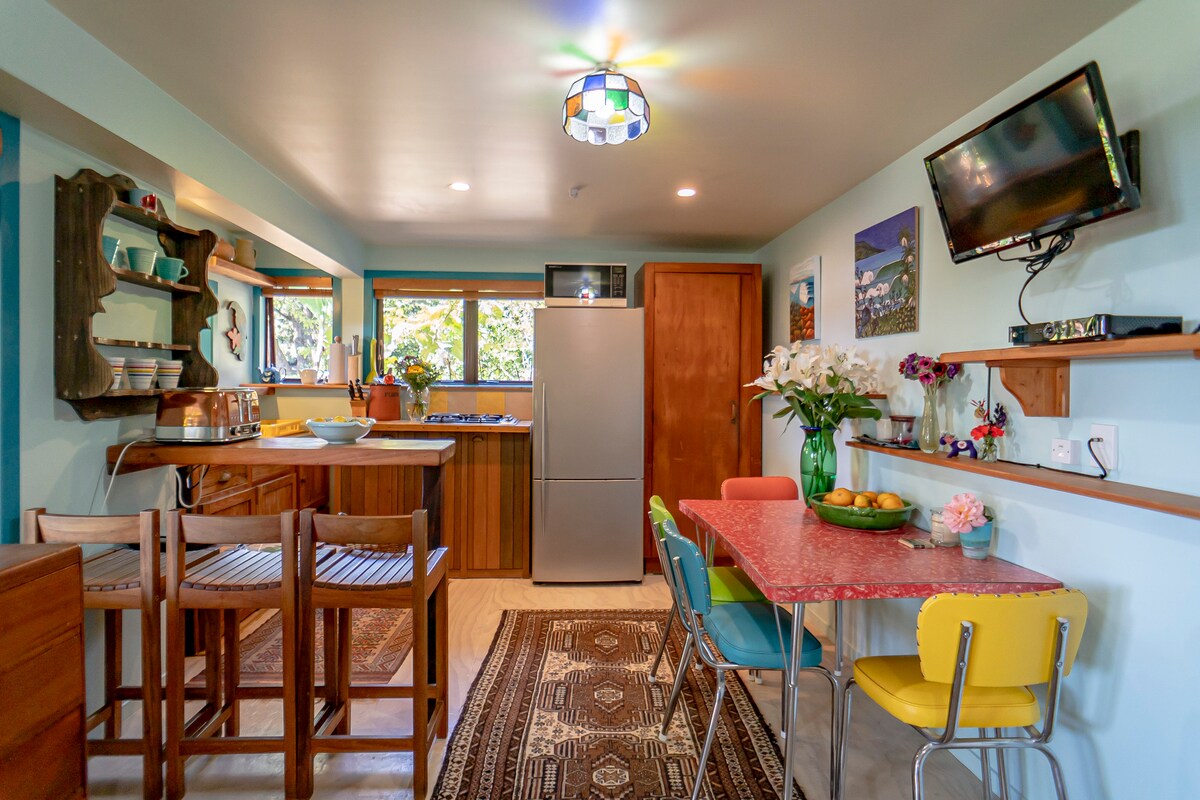 Joyce's Place es una casa de campo independiente y soleada situada en una carretera privada y tranquila en el corazón del municipio de Raglan. Situada a menos de 5 minutos a pie de la ciudad, de todas las cafeterías, tiendas y supermercados. La casa tiene una cocina completa, salón y comedor, cama tamaño queen y baño, y tiene wifi gratuito y muchas otras comodidades del hogar para que tu estancia sea agradable. Perfecta para personas que viajan solas o en pareja.