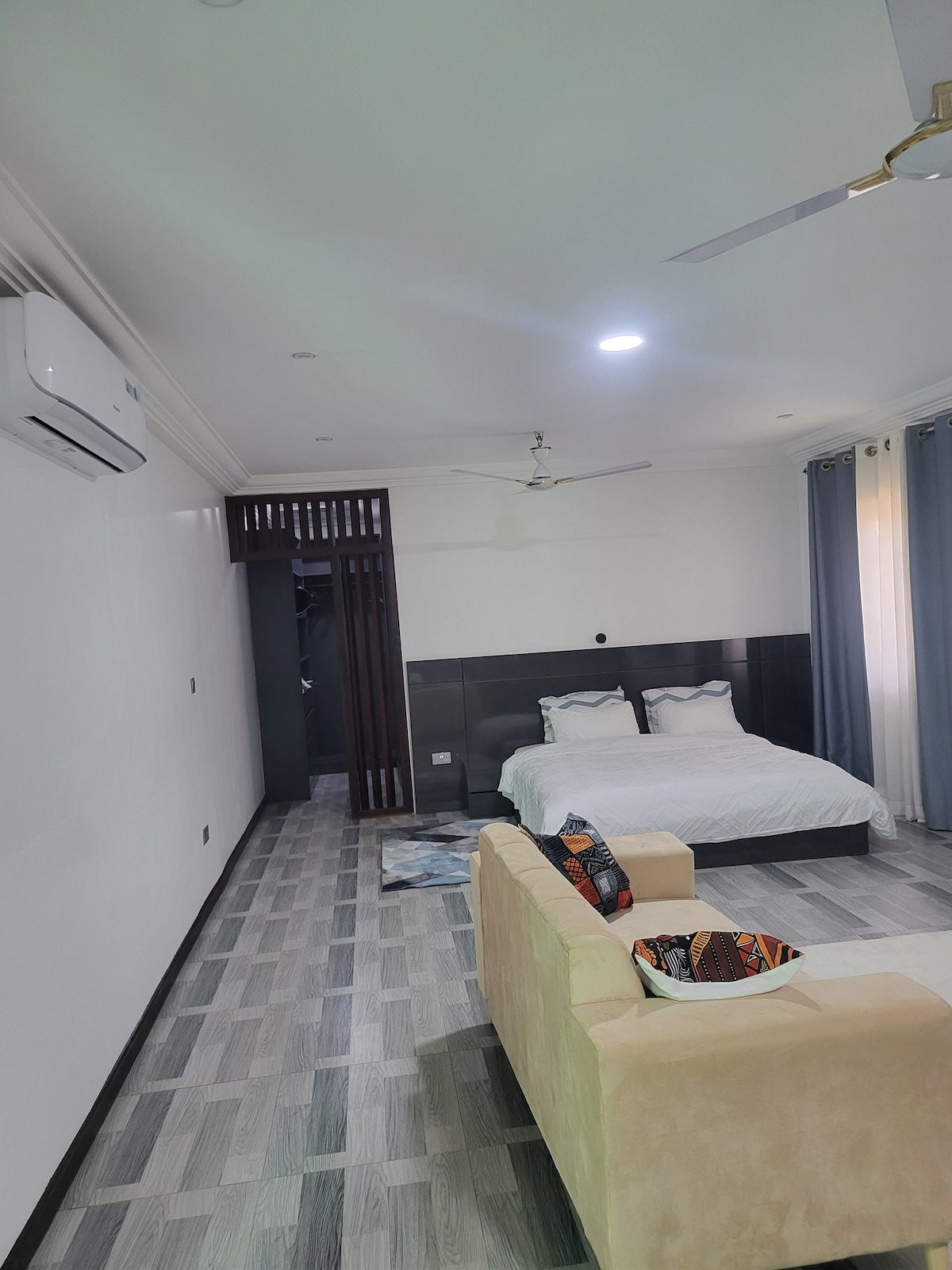 This unique place has a style all its own. Stunning, modern studio designed for comfort and style. This sleek, secure space features a king-size bed, walk-in closet, fully equipped kitchen, 55" SmartTV, high-speed internet, A/C, and a standby generator. Ideal for solo travelers or couples. Located in a peaceful neighborhood just 25km from Accra Airport. Airport pickup and drop-off are available upon request for a fee. Secure parking is available.