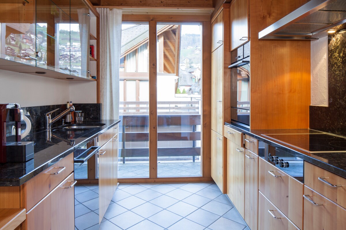 Sala de estar con chimenea, televisor LED de alta definición y zona de comedor, cocina bien equipada con lavavajillas, cafetera y vaporera/horno, set de fondue para raclette, carne y queso, baño con ducha y WC en esta planta. En la planta superior, habitación doble (con balcón pequeño), una habitación con dos camas y un baño con bañera, ducha y Closomat. • Garaje subterráneo con ascensor al apartamento, aparcamiento gratuito disponible. • Cuarto de esquís y lavandería en el sótano. Wifi gratuito.