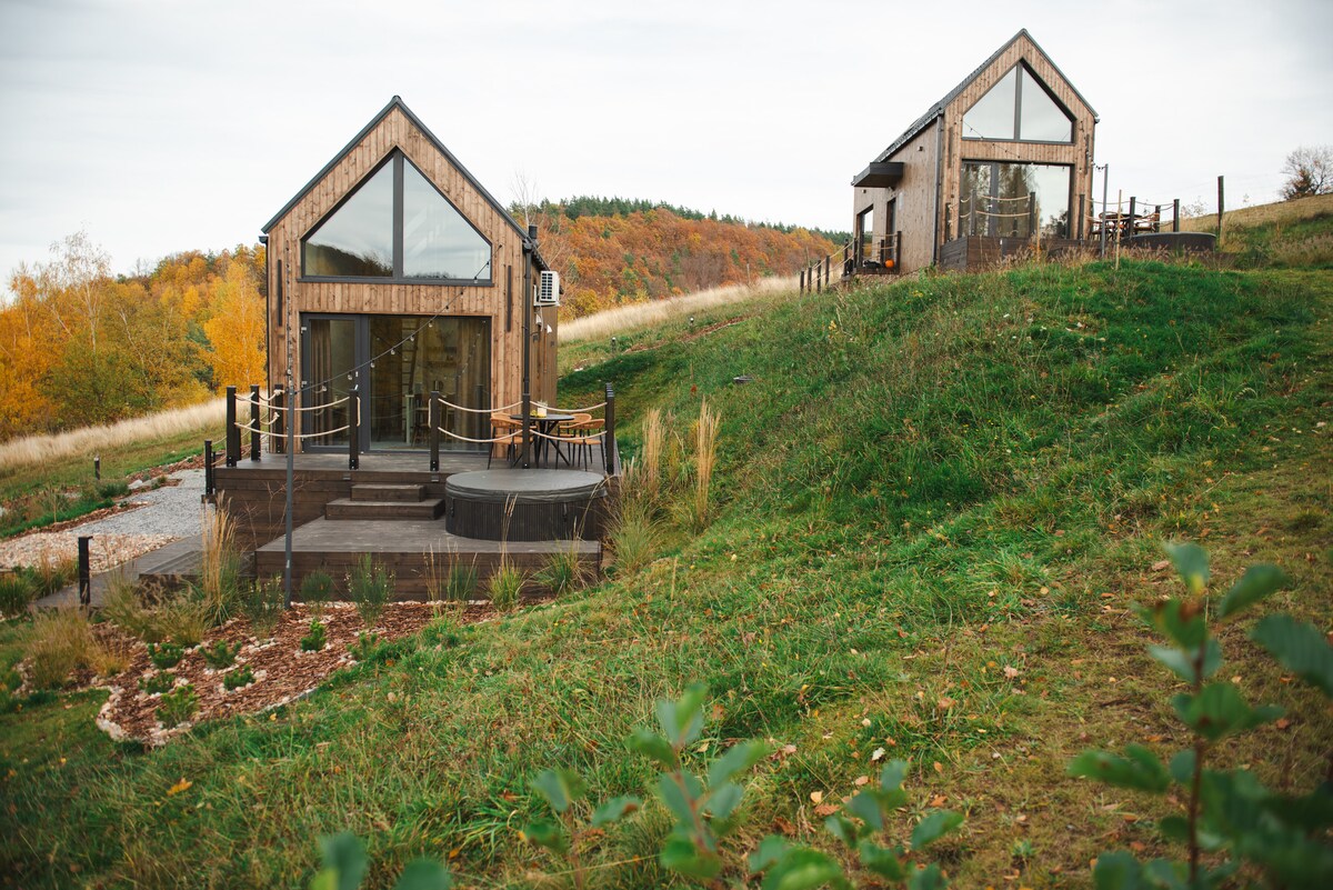 Descubre un lugar donde el silencio, el confort y la naturaleza crean una armonía perfecta. Domki na Kukułce son casas de campo exclusivas y totalmente equipadas ubicadas en uno de los rincones más bellos de la Baja Silesia, con una hermosa vista panorámica del valle de Kłodzko. Cada una de nuestras casas ha sido diseñada pensando en la máxima comodidad y privacidad de los huéspedes. La cálida madera, el diseño moderno, los grandes acristalamientos y los materiales naturales crean un ambiente de relajación y lujo.