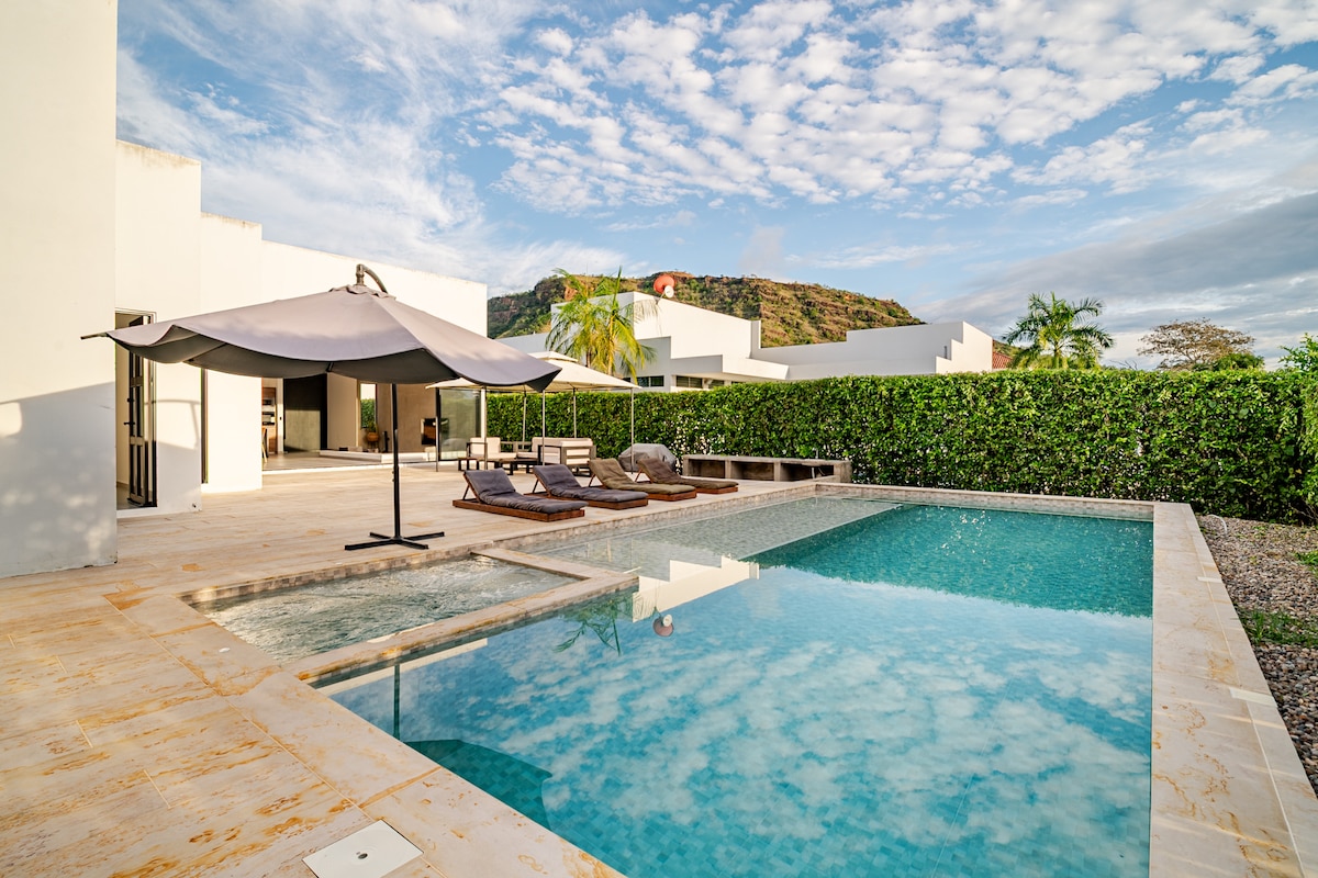 Casa Blanca, Es una casa nueva con un diseño minimalista y moderno que consta de 3 habitaciones con baño independiente y aire acondicionado con capacidad para 14 personas, cuenta con una amplia sala cómoda para descansar y ver televisión y un comedor y cocina completamente equipada, también consta de una piscina privada , un jacuzzi con masajeadores , una zona de asados para disfrutar con amigos y familia y un turco espectacular para lograr el nivel mas alto de relajación.