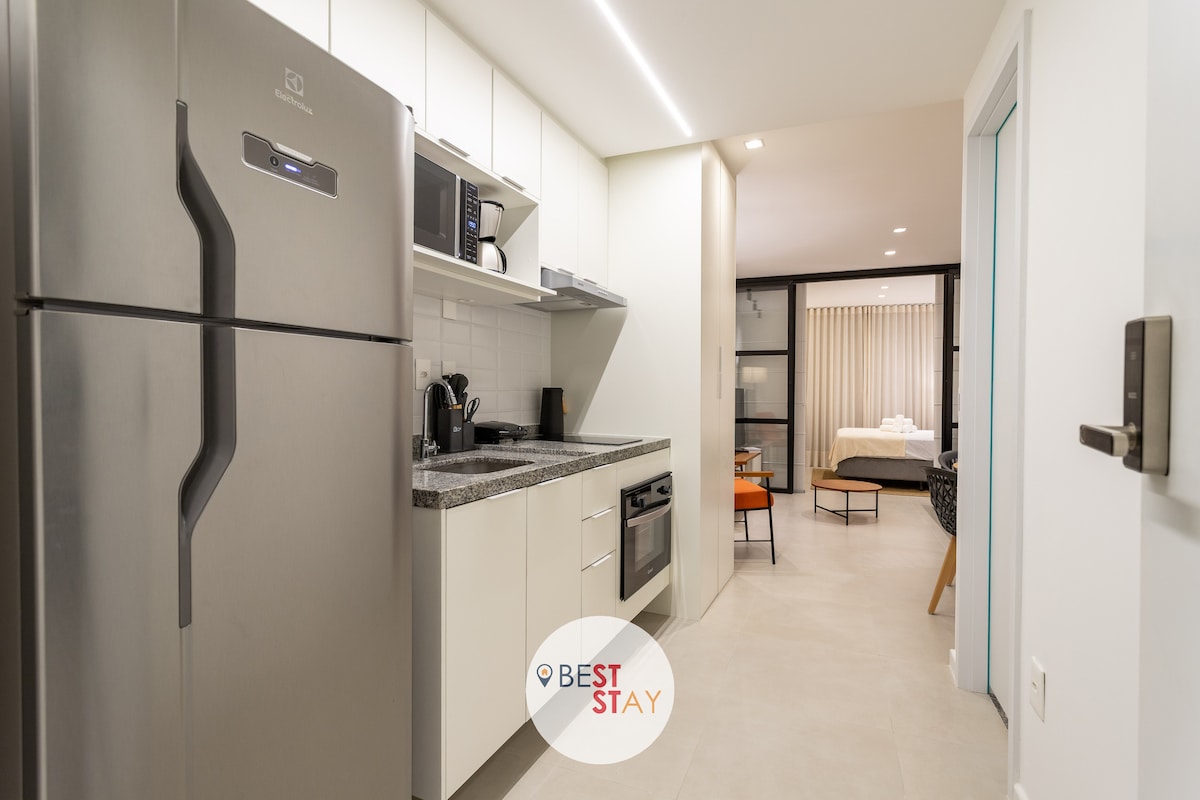 El loft, decorado con estilo, tiene un concepto abierto con un divisor de madera que separa el dormitorio de la sala y la cocina. Tiene 2 televisores, uno en el dormitorio y otro en la sala. Con una cómoda cama doble, ventanas que dejan entrar luz natural, una cocina integrada con la sala de estar y un amplio balcón en forma de L con una vista surrealista de la Playa de Icaraí. Totalmente equipado, está a 200m de la playa, cerca de farmacias, mercado, restaurantes y la calle famosa de Icaraí.