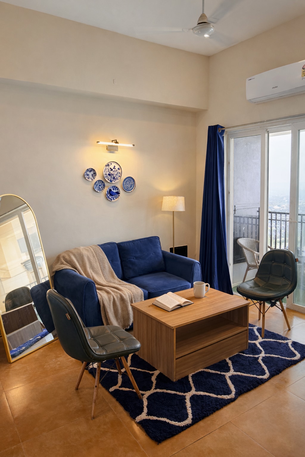 Nuestro apartamento de 2 dormitorios de nueva construcción combina la comodidad moderna con el encanto natural. El espacio cuenta con 2 dormitorios serenos con camas tamaño queen, una amplia sala de estar, una cocina bien equipada, 2 baños: uno adjunto al dormitorio principal y otro accesible desde la sala de estar y el segundo dormitorio y un balcón en forma de L que ofrece excelentes vistas de la ciudad. ¡La propiedad se encuentra cerca de un centro comercial prémium en Noida! Esta ubicación bien situada te ofrece la comodidad de tiendas, cafeterías y entretenimiento.