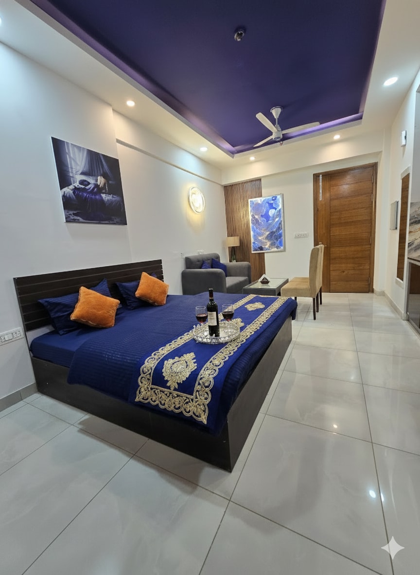 🛏️ The Mulberry Silk — Blue Saphire Chic. Central. & just the right amount of sinful. Welcome to your seductive sanctuary in the heart of Noida — where the blue tones aren’t just calming, they’re tempting. Whether u're a couple looking to escape the ordinary, solo traveler seeking comfort with a twist, or just someone who enjoys little luxury with their late-night indulgence. This space is ready to play host. Soft sheets, hard decisions — welcome to Noida’s most seductive shade of blue.