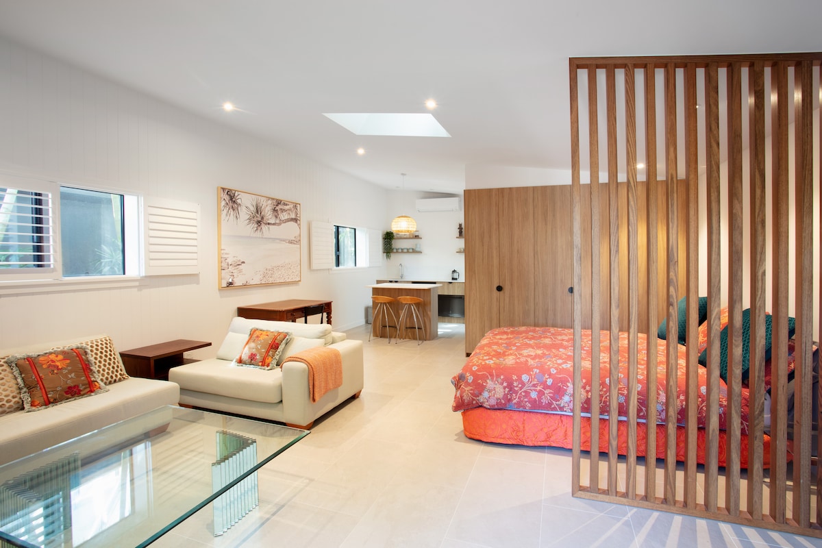 NOTE: construction noise down street mon - fri 7-4. Pandanus suite is fully renovated & beautifully decorated with careful attention to detail and a fresh “on trend” feel with warm wood flooring, leather couches, linens, soft lighting, and wool rugs. Nestled amongst tree tops enjoying lush views or listening to laughing Kookaburras from your private terrace. Relax and enjoy the serenity in your self-contained 2 bedroom unit with your own private entrance situated in a 3 unit house.