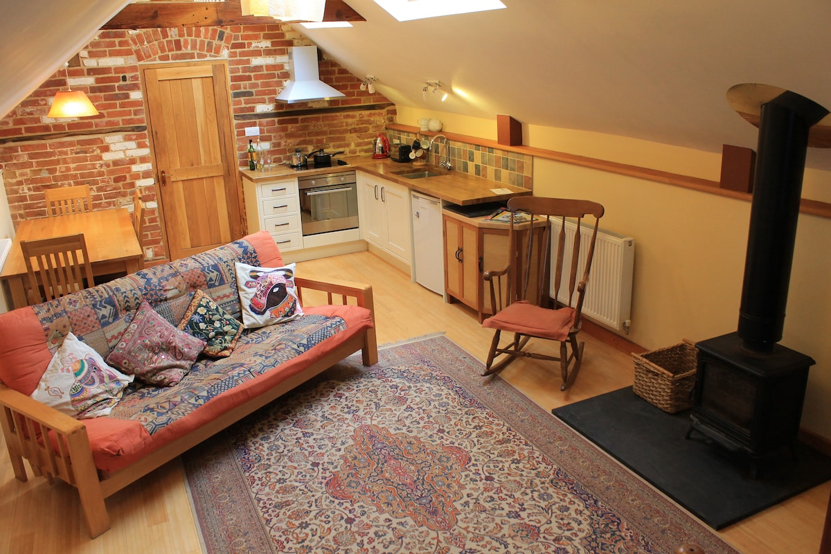 Precioso espacio amplio y luminoso con una estufa de leña e instalaciones para una vida independiente. La habitación se encuentra en un extremo de una casa familiar, encima de la antigua casa de carruajes. Ideal para dos personas y un futón doble disponible para dos personas más bajo petición.