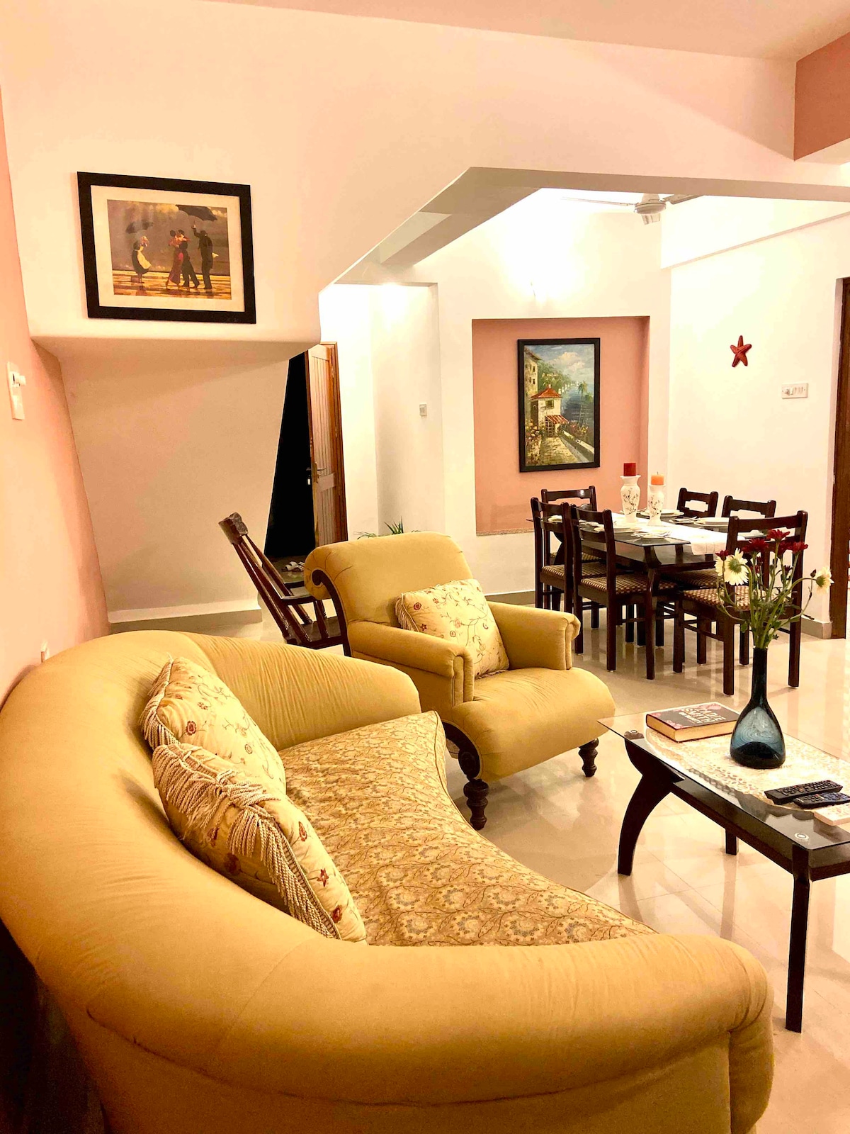 Relájate con toda la familia en este alojamiento tranquilo. Todos los dormitorios tienen aire acondicionado. Al estar en la frontera de la ciudad de Margao, esta propiedad es muy tranquila y pacífica, aunque muy cerca del mercado , el hospital de la parada de autobuses, la estación de tren y muchos restaurantes de renombre, etc. Se encuentra a solo 5 km de la playa de Colva y de todas las playas vecinas del sur de Goa. Esta propiedad tiene un encantador patio delantero y un patio trasero cubierto donde se puede disfrutar del aire libre sentado bajo la sombra del coco y el árbol de mango.