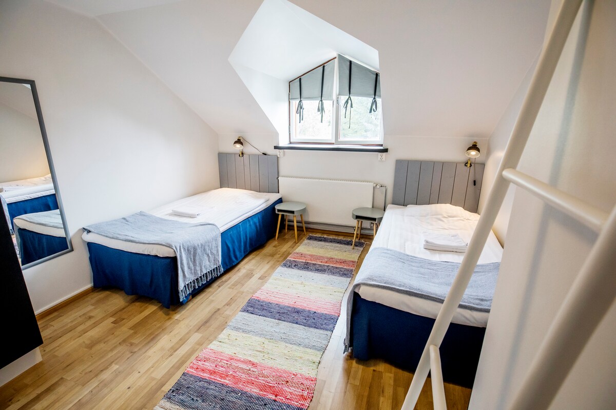 ¡Este destino es para ti, que anhelas algo completamente diferente! El espacio Tammi combina de manera fascinante la auténtica atmósfera de una antigua escuela y la sofisticación de un hotel boutique. Los diferentes matices de verde y los suaves tonos marrones utilizados en la decoración de Tammi te transportarán a la sombra de las hojas de roble. Las lujosas camas, la alfombra de pared a pared y los suaves tejidos ofrecen a nuestros huéspedes una noche de sueño reparador.