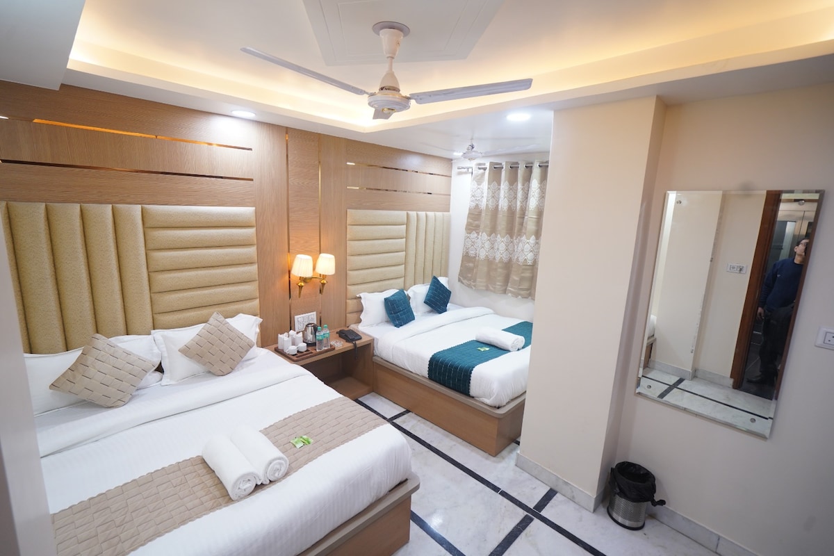 ◆Comfortable & stylish hotel room perfect for solo travelers or small groups. ◆Easy access to : ✔Sir Ganga Ram City Hospital – 500 meters ✔Apollo Spectra Hospitals – 700 meters ✔Karol Bagh Market & Metro Station – 1 km ✔Indira Gandhi International Airport – 19.9 km ◆Room includes a TV, mini fridge, and ensuite bathroom. ◆On-site restaurant with ample seating & air-conditioning. ◆Welcoming reception area with plush sofas, TV & lift access.