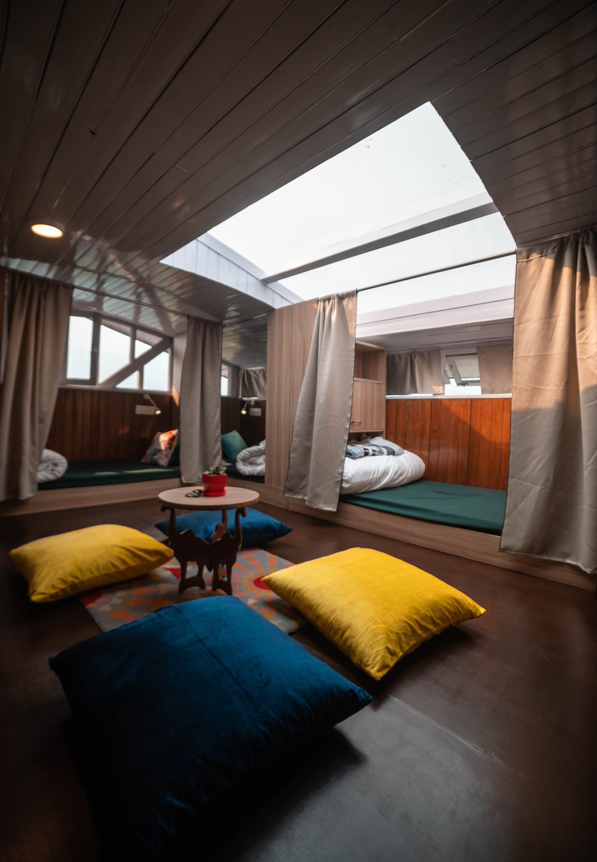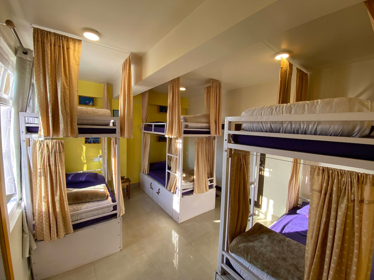Un albergue para mochileros lleno de colores, energía y un ambiente social. Cada rincón del albergue está bendecido con una vista de las colinas de Gangtok durante el día, mientras que al atardecer, las luces de la ciudad brillan en la distancia. La vida del albergue es la azotea, donde organizamos eventos y conciertos y vemos una hermosa puesta de sol desde. También tenemos un minibar que sirve cervezas y vino, junto con un columpio, futbolín y carrom para mantener a los viajeros comprometidos.