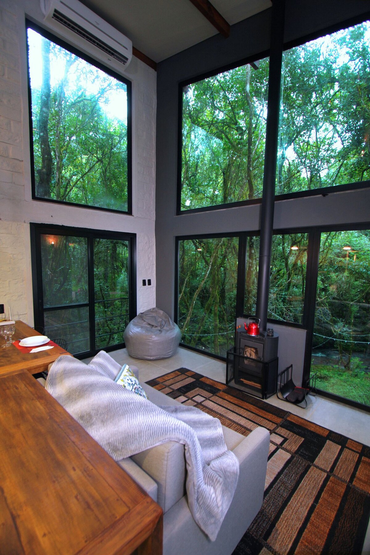 Felicità te sintoniza com a natureza. Paredes de vidro de 5 metros garantem a imersão na mata nativa, às margens de um arroio cristalino! Curta o frio da Serra Gaúcha deitado em frente à lareira de dupla combustão, muitos aquecedores, cobertores e piso aquecido no banheiro. Colchões de molas ensacadas e lençóis de 400 fios garantem o sono revigorante. Tudo isso, pertinho de Gramado e de Nova Petrópolis, com acesso fácil por estrada asfaltada. Descontos especiais de segunda a quinta!