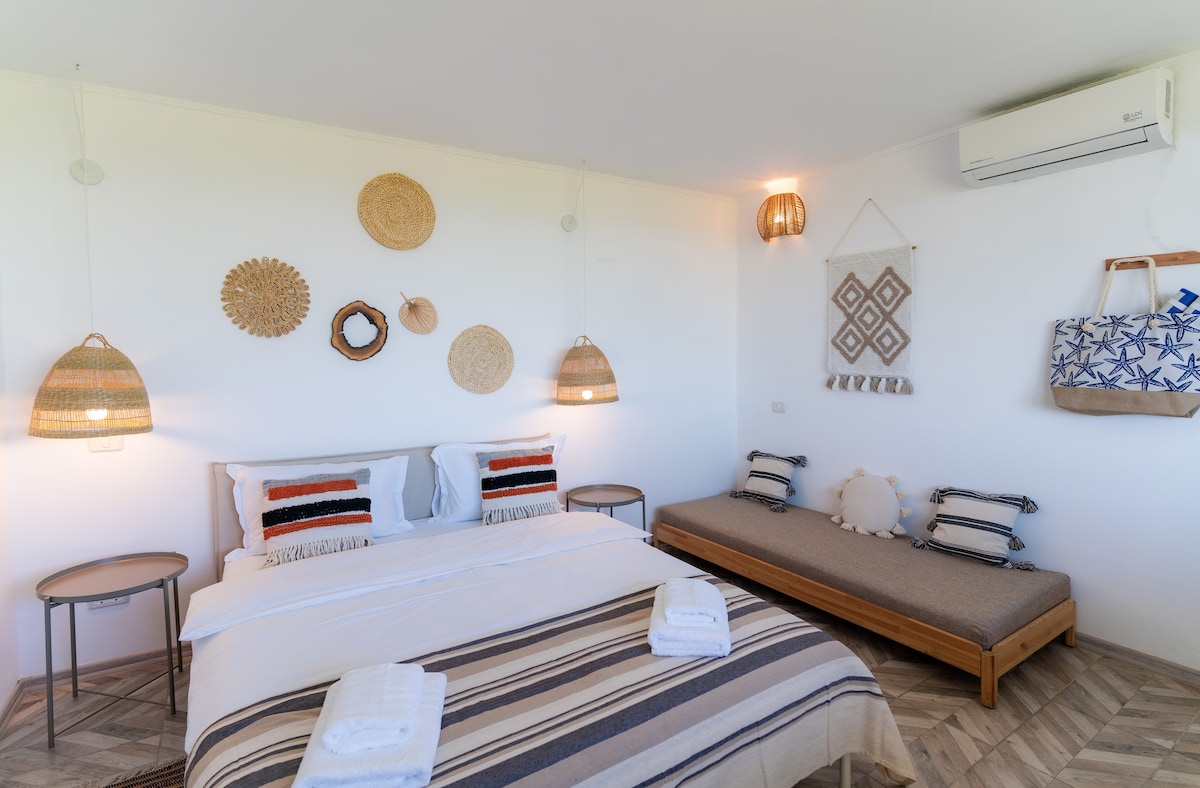 Take it easy at this unique and tranquil getaway. Right on the Corbu beach, where wilderness is still in bloom, admire the nature and relax away from the busy city life. Our garden-view double room is the perfect option for you, combining comfort and premium amenities, while fully embracing the quietness of the green and cozy yard. Begin your mornings by savoring a cup of freshly brewed coffee on the outside patio and let the rays of sunshine guide you throughout the day.
