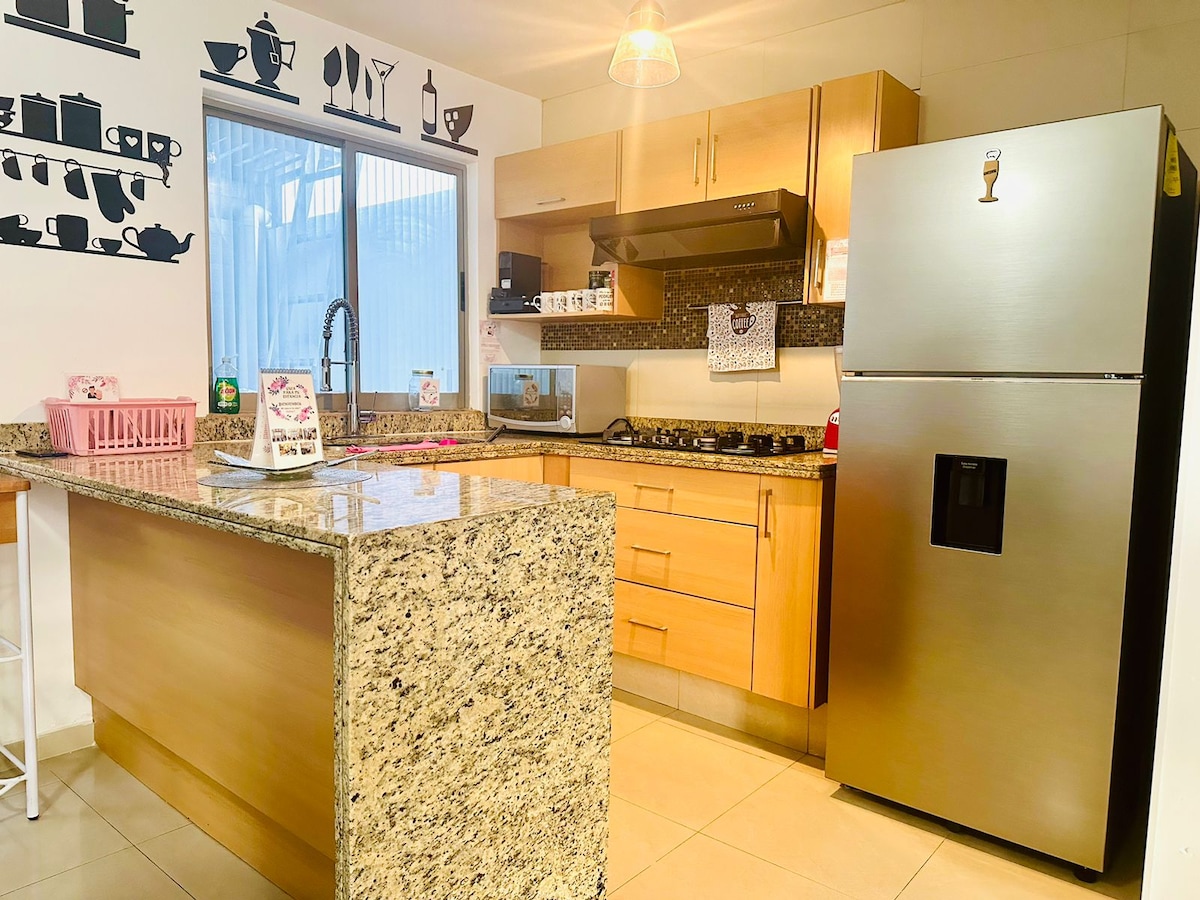 Relájate en este espacio tranquilo y elegante, ideal para pasar unos días de descanso. Con alberca privada climatizada ( 30 a 32 grados), relajante jardín, terraza abierta, cocineta y asador esta completamente equipada. Cuenta con 2 recamaras con un excelente diseño y preparadas para que disfrutes de un descanso placentero, con cama King en la principal y Queen en la segunda recamara ✔ Minisplit en ambas recamaras. ✔ Mini enfriador en recamara principal ✔ Internet en toda la casa de 500 Megas