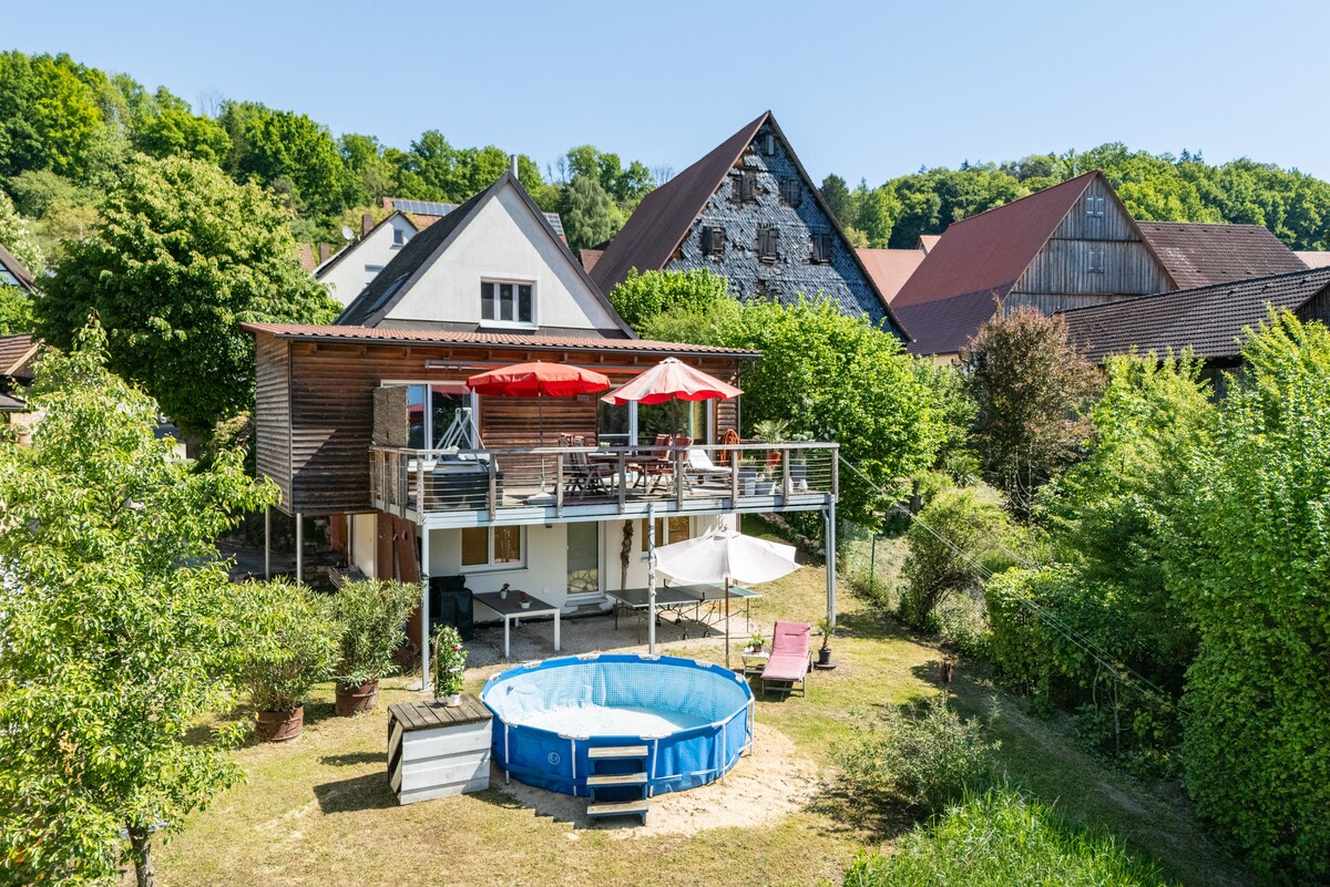 Apartamento, en el primer piso, dos zonas de descanso abiertas (sin habitaciones cerradas) con techo de escalera, balcones en todas las direcciones. ¡Una empinada escalera conduce al techo para dormir! Sin embargo, el sofá cama doble está en la zona de estar inferior. Zona de jardín con chimenea, sauna al aire libre. Cocina totalmente equipada, con cocina de gas. Hay especias disponibles, pero tienes que traer tu propio café. En verano, el agua de servicio se calienta a través del sistema solar. Puede que la calefacción tarde un poco en ponerse en marcha en Wolken.