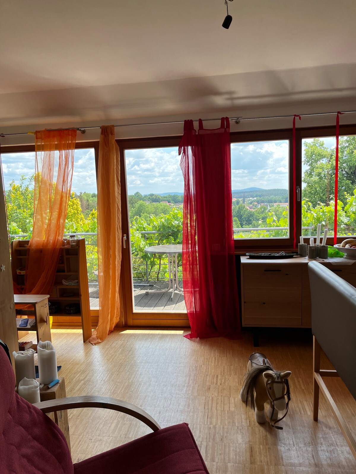 Wohnung, im ersten Stock, zwei offenen Schlafbereichen (keine abgeschlossenen Räume) Kletterdach, Balkone in alle Himmelsrichtungen. Ins Schlafdach führt eine steile Treppe! Das Doppel-Schlafsofa ist allerdings im unteren Wohnbereich. Gartenanteil mit Feuerstelle, Außensauna. Voll ausgestattet Küche, mit Gasherd.. Gewürze sind vorhanden, Kaffee müsst ihr selber mitbringen. Im Sommer wird das Brauchwasser über die Solaranlage erwärmt. Es kann etwas dauern bis bei Wolken die Heizung anspringt.