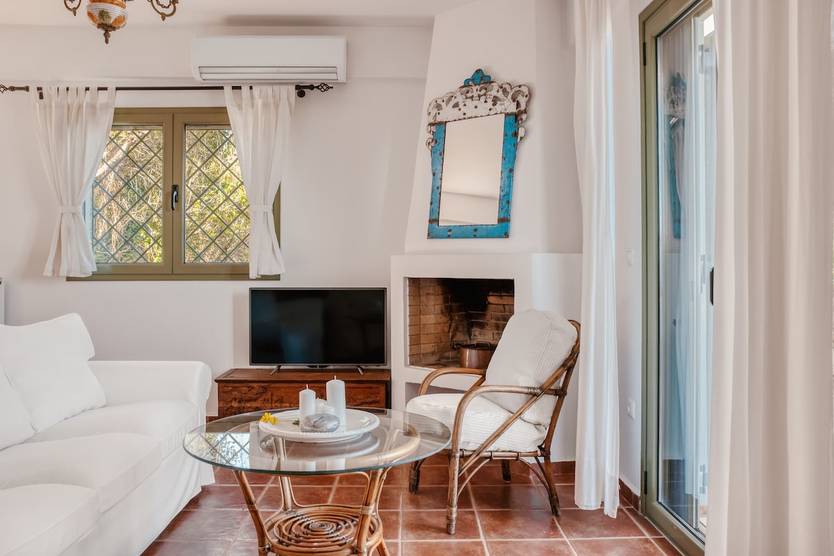 La gens jónica está construida sobre una colina, en una parcela de tierra de 4 acres en total. El edificio en sí mide 85 metros cuadrados, lo que garantiza la máxima comodidad y capacidad para 4 personas. La villa ofrece 2 dormitorios en la villa principal. Cada uno tiene su propio baño privado; dos dormitorios están equipados con una cama tamaño king cada uno,