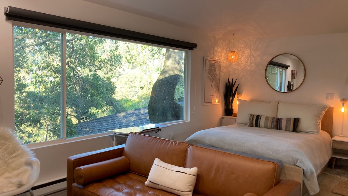 This unique, well equipped, 1 Bed cute little studio (that we love) is detached and fenced off from our main house. It has a separate entrance through a side gate and it's own private rear deck, with a seating and dining area... that overlooks Sausal Creek and Dimond Park. The tall willow that grows along the creek gives the deck the perfect amount of privacy and with the tranquil sound of the creek flowing (not during dry season) you would almost forget you are in an urban city.
