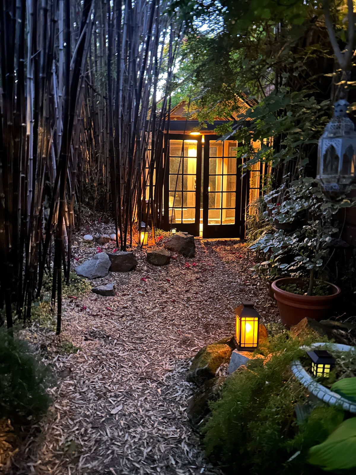 The cottage is newly remodeled as of March 2022 and now has its own kitchen and bathroom. It is a separate unit in my backyard with vaulted ceilings which gives a spacious feel and french doors that open onto the lush garden. Queen size high end natural organic fiber bed (Earthsake.com), with down comforter + 4 pillows. Dining table and stools. LCD TV, clothes valet, work desk and great internet. Its very quiet and my guests seem to love having a private retreat type space to themselves.