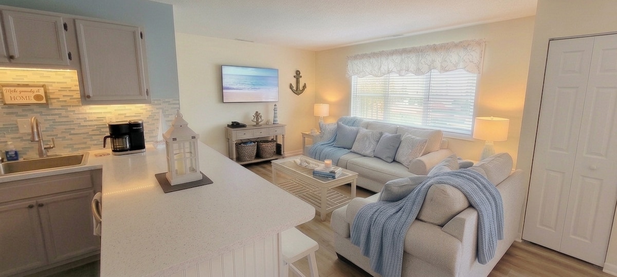 Moderno apartamento de 2 dormitorios/2 baños junto a la bahía en Ocean City, a solo 2 manzanas de la playa, el paseo marítimo y los eventos de la ensenada. Capacidad para 6 personas con cama tamaño king y 2 camas tamaño queen, cocina completa, balcón, piscina al aire libre, televisores inteligentes, wifi y aparcamiento gratuito (incluido el pase de invitados). Camina a Springfest, Bike Week, espectáculos aéreos, paseos y restaurantes. Equipo de playa y lavandería en el sitio incluidos. Aparca una vez, camina a todas partes: perfecto para familias, parejas y asistentes a eventos durante todo el año.