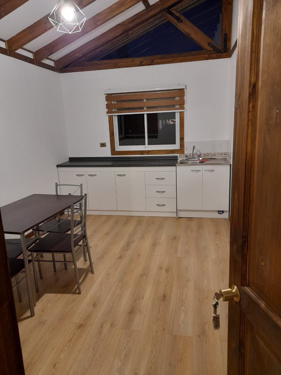 Cabaña para 4-5 personas ubicados en un primer piso, cuenta con 1 cama matrimonial, 1 cama y 1 camarote de una plaza, un baño, TV cable, Wifi, terraza, ropa de cama, toalla, jabón/lavalozas, refrigerador, cocina, utensilios para cocinar para 4-5 personas, calefacción eléctrica y estacionamiento privado gratuito.