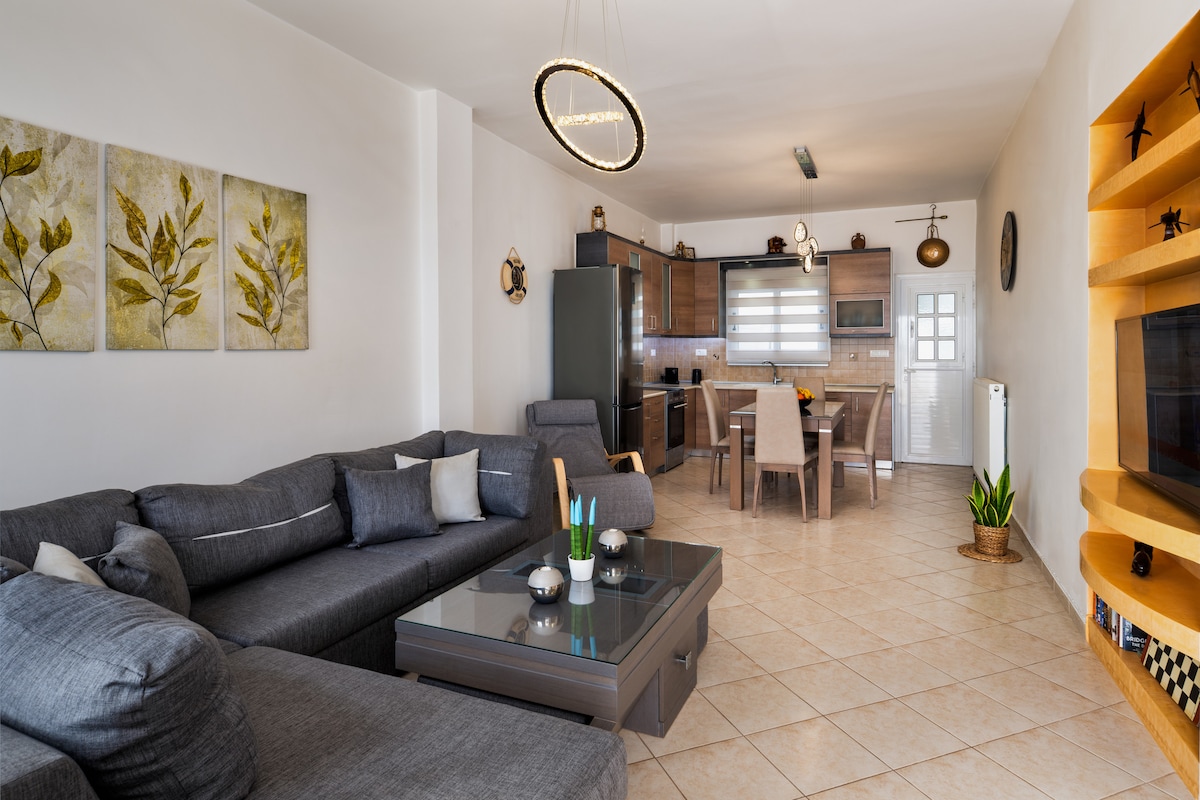 Maisonette apartment 75 sq.m. with private entrance, courtyard and a sea view balcony. Fully air-conditioned, it features a spacious living room, a master bedroom, and two bathrooms with walk-in shower. The fully equipped kitchen includes a stovetop, oven, microwave, refrigerator and all essential cookware. Amenities also include a washing machine, two flat-screen TVs with streaming services, soundproofing, a coffee maker, and a kettle. The apartment offers a queen-size bed and a sofa bed.