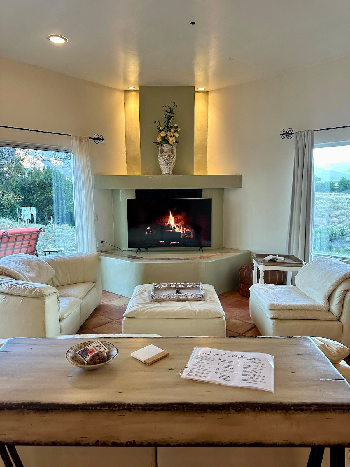 La villa Sage Ranch de Ojai está diseñada arquitectónicamente para capturar las espectaculares vistas de la gran cordillera Topa Topa de Ojai desde cada habitación y con entradas privadas. La villa se encuentra en 10 acres de espacio abierto centrado en la abundante vida silvestre, bosques de robles naturales y senderos w/cielos oscuros nocturnos tan poderosos, se siente el aislamiento de la infinidad. No importa si te quedas una semana o un mes, tu experiencia será inspiradora y aportará buena fortuna y tranquilidad al camino por el que viajas.